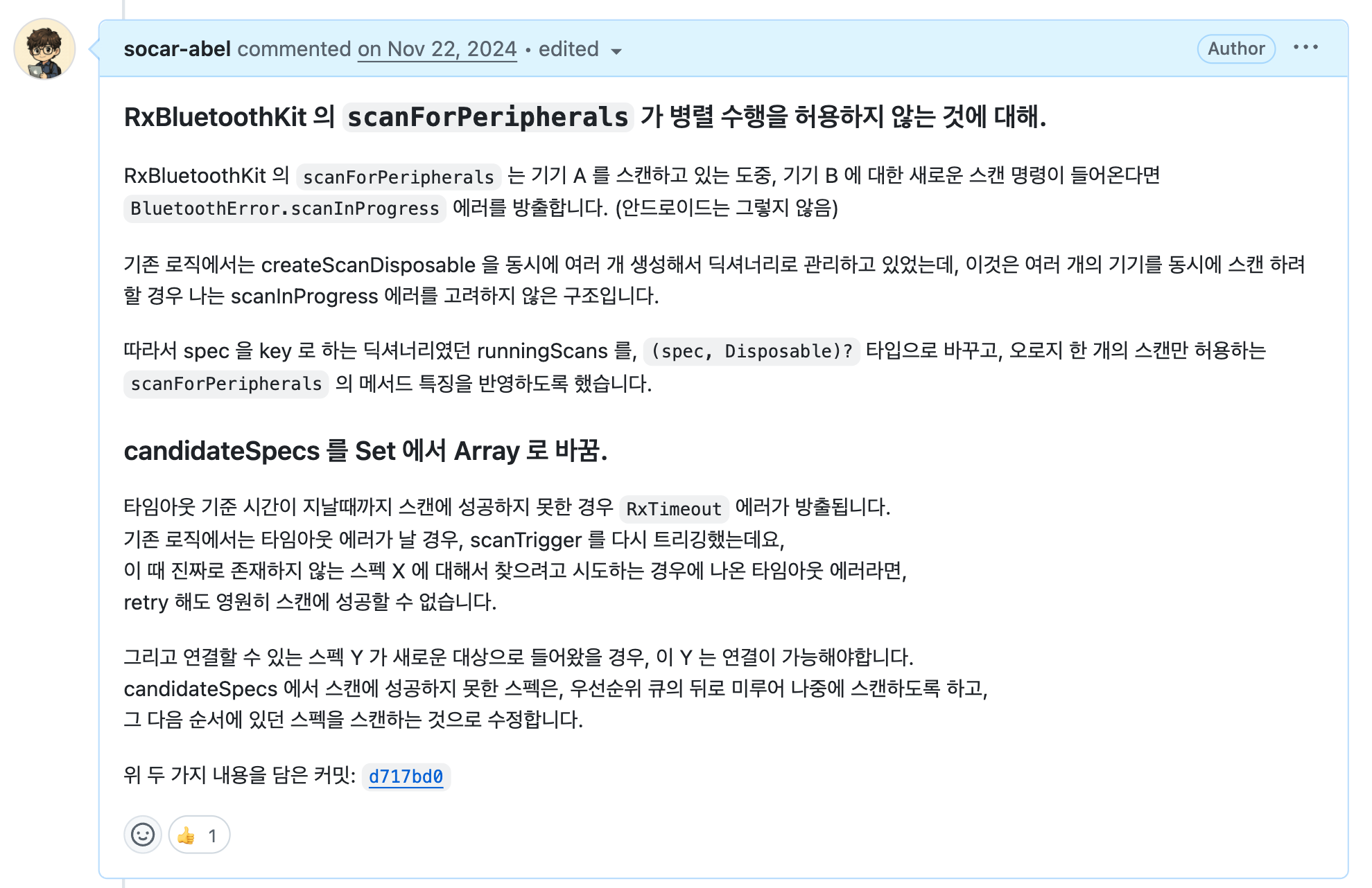 결과적으로 이 두 관심사를 분리함으로써, 쏘카앱은 차량과의 물리적인 연결을 끊지 않고도 동적인 비즈니스 로직을 실시간으로 교체할 수 있는 유연성을 확보합니다. BluetoothSpec 이 같으면 같은 기기로 간주할 수 있기 때문입니다.