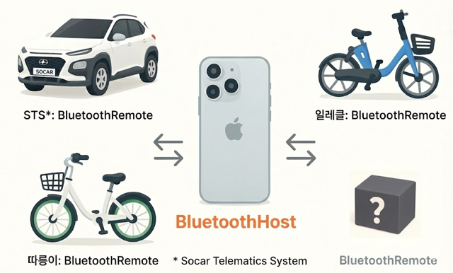 쏘카프레임은 블루투스 연결 관리자를 BluetoothHost 로, 블루투스 연결 대상을 BluetoothRemote 로 추상화합니다. (이하 호스트 = BluetoothHost, 리모트 = BluetoothRemote)